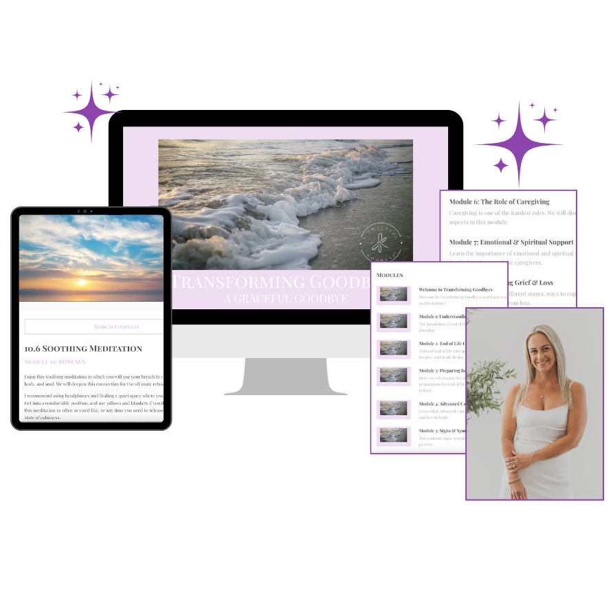 Transforming Goodbyes includes 9 MODULES with encouraging videos designed to teach you how to have peace and clarity as you navigate end of life with a loved one.